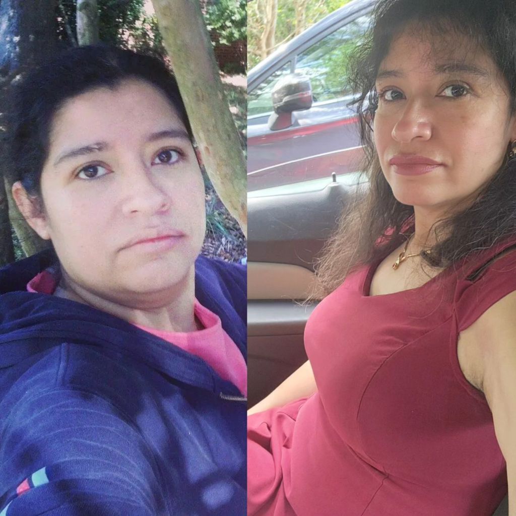 2014 me in the blue hoodie-2023 me in the red dress,