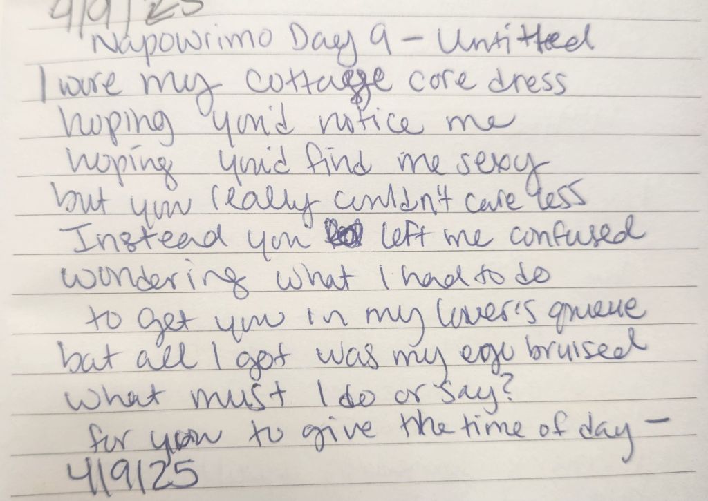 Es abril nuevamente y no solo florece la primavera, sino también la creatividad que la acompaña. Y, por supuesto, es el mes nacional de la poesía y todos los años desde 2022 intentó participar en NaPoWrimo, que es una actividad en la que escribo un poema al día y lo publico en mi blog. Estoy emocionado de ver qué poemas locos se me ocurren. El año pasado mi poema favorito fue uno picante que escribí sobre Yung Gravy y que terminé leyendo en frente del público . Además, este año, decidí darles mis propios temas originales para inspirarlos a escribir sus propios poemas. Si quieren pueden enviarme su poema y lo publicaré en mi blog o simplemente pueden guardarlo entre las páginas de su diario. El año pasado tenía como objetivo publicar mis propios mensajes para el Mes Nacional de la Poesía y aquí estamos. Este año decidí usar los títulos de los primeros 30 poemas que he escrito.