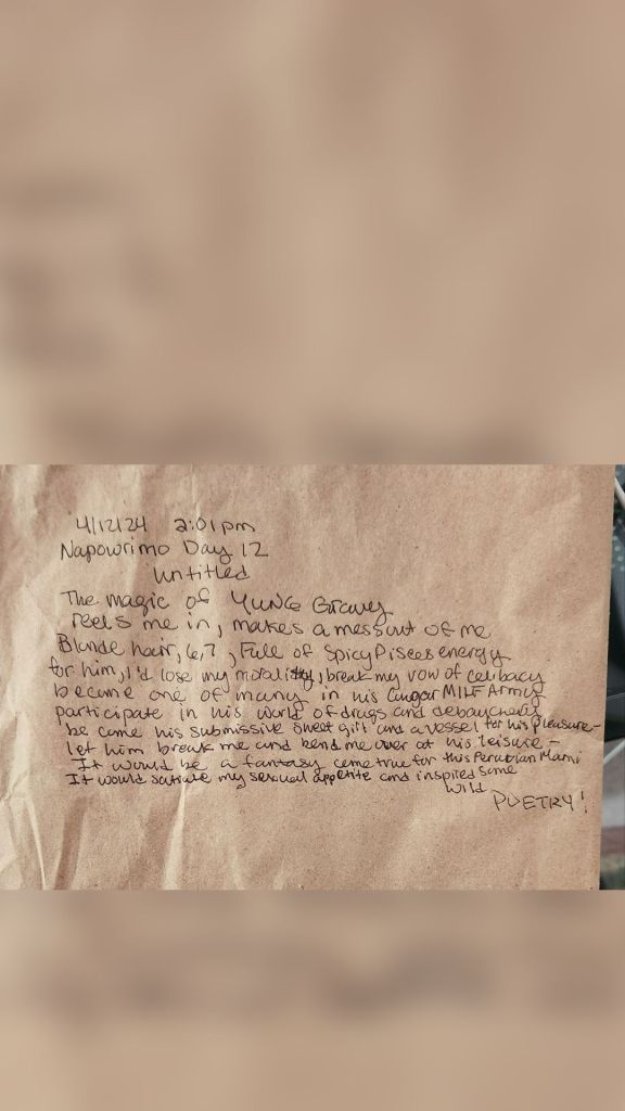 It’s April again and it’s not only spring that is in bloom but also the creativity that goes along with it. And of course, it’s national Poetry month and every year since 2022 I try to participate in NaPoWrimo which is an activity where I write a poem a day and post it on my blog. I use prompts from this website for inspiration: https://www.napowrimo.net/ and as always I’m excited to see what crazy poems I come up with. Last year my favorite poem was a spicy one I wrote about Yung Gravy that I ended up performing at open mic.