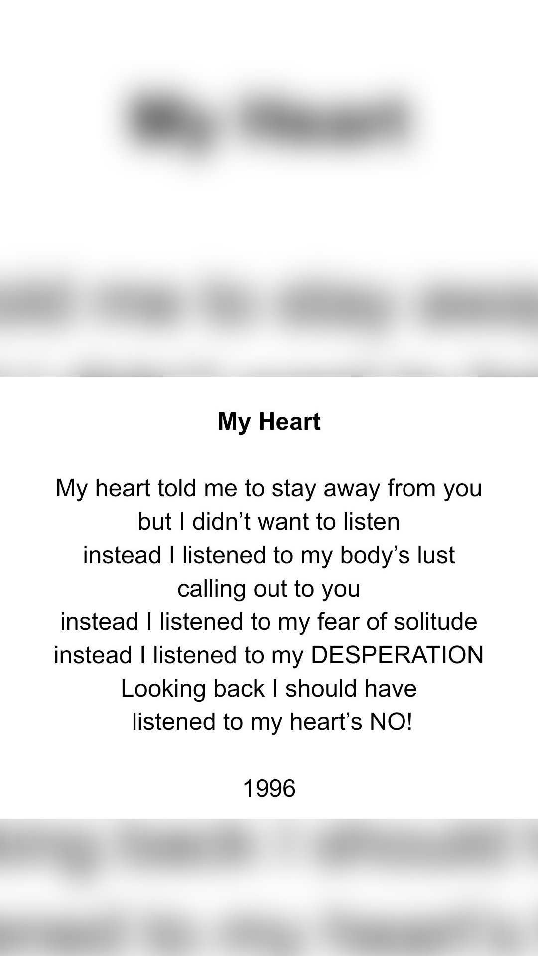 I wrote this in 2001 after experiencing a really bad break up. Break ups tend not just break my heart but also make question my self worth. It’s really hard for me to get over someone especially if I get super attached to that person. In this case, I had been with the dude for like 2 months and I guess thought that maybe he was “the one”. Well that wasn’t the case when I found out he had been cheating on me the entire time. At least it inspired dozens and dozens of poems. Lol.